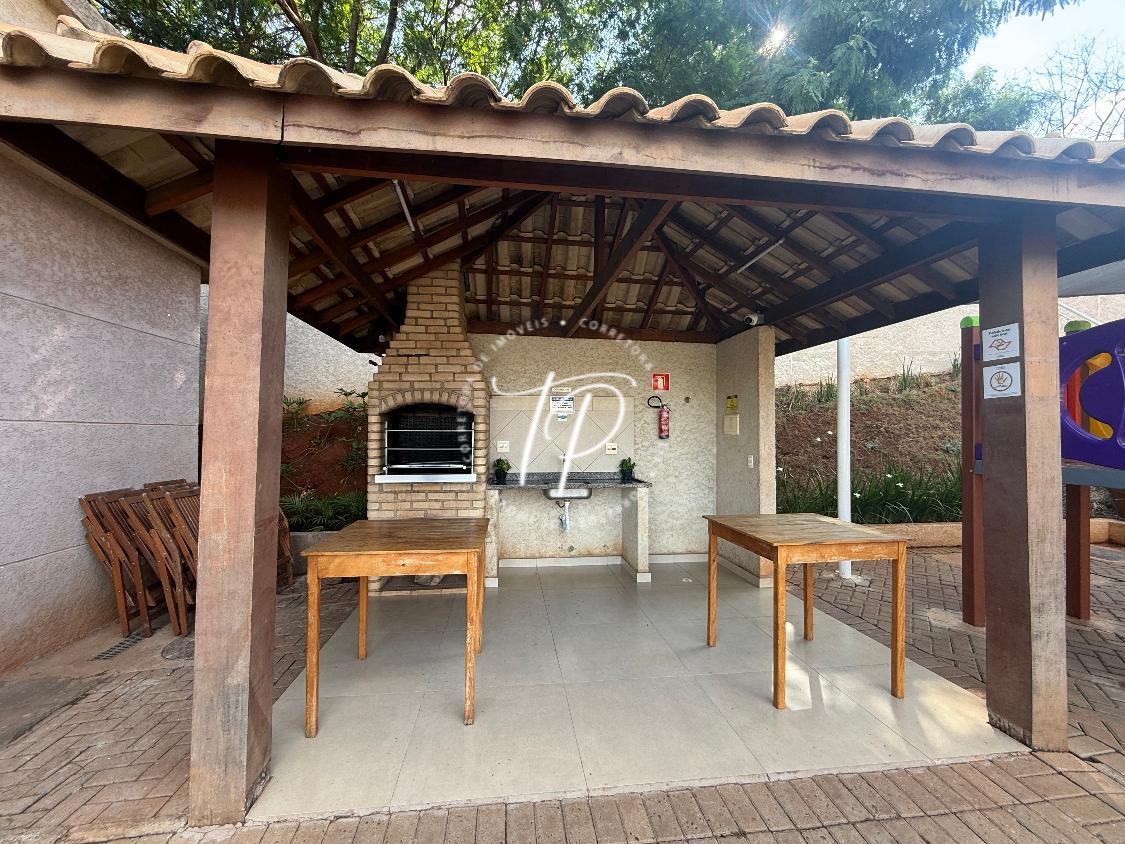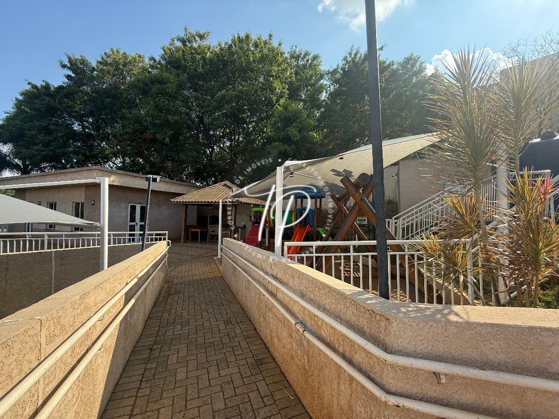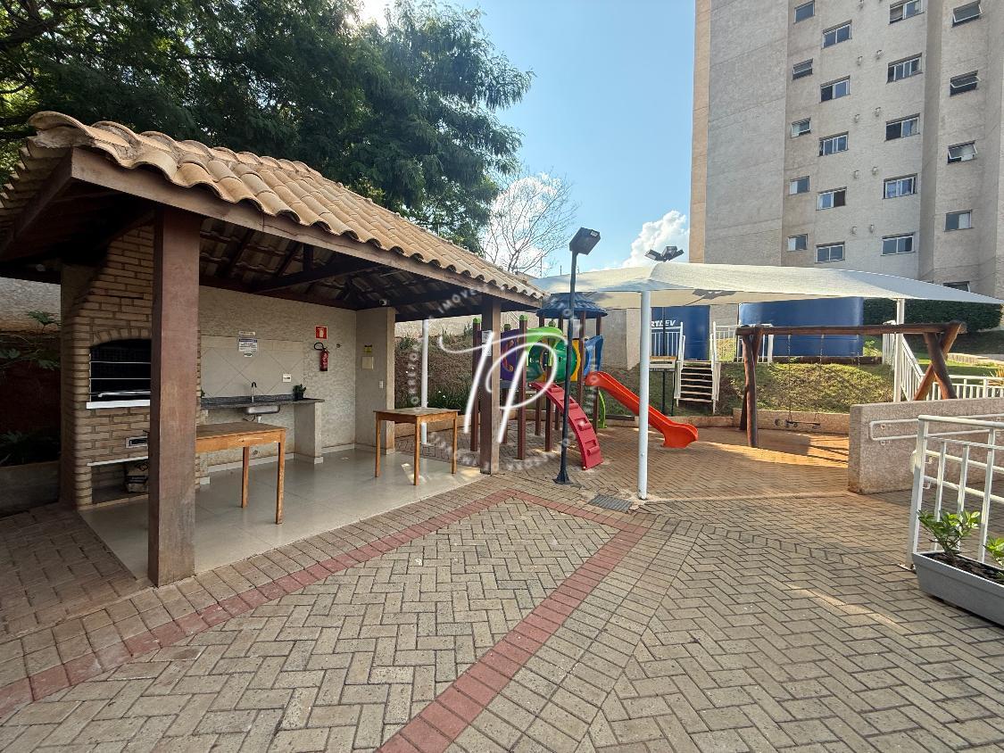 Condomínio com playground, campo gramado e salão de festas.
