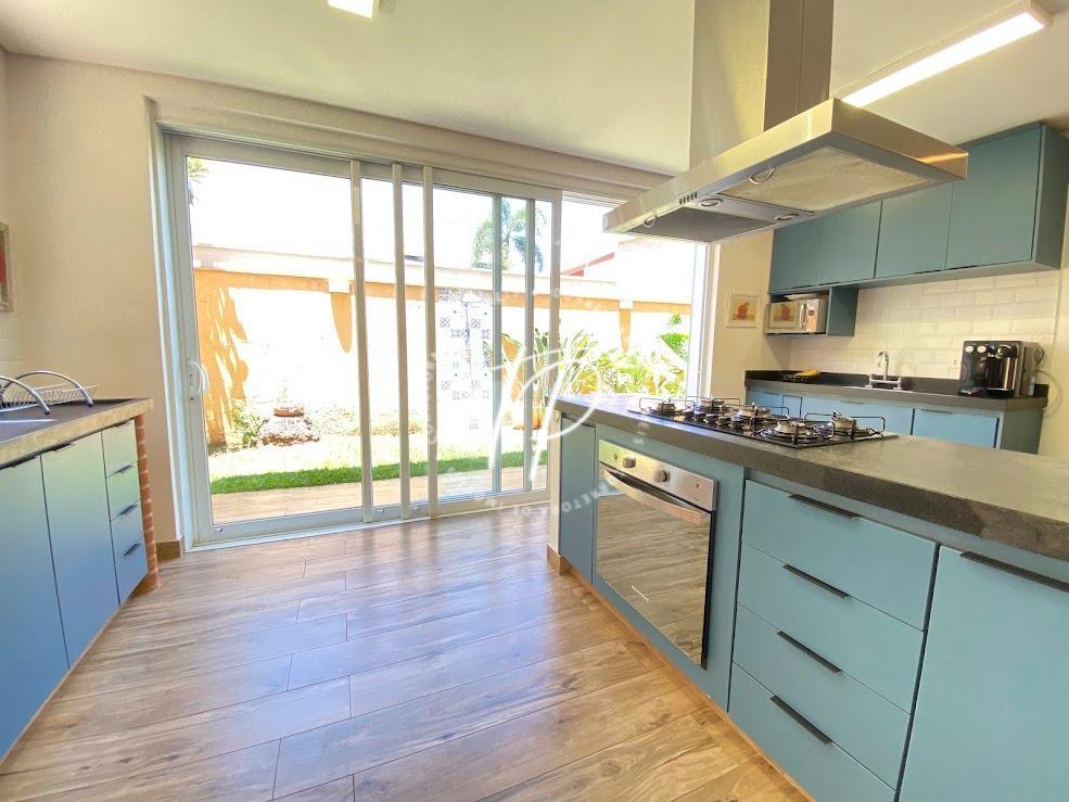 Cozinha americana, com armários, cooktop, coifa, forno, churrasqueira