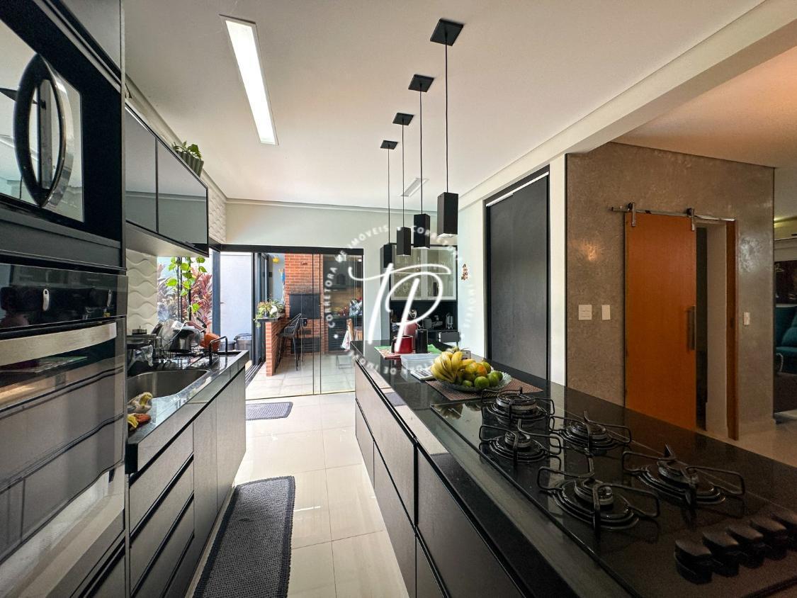 Cozinha completa de armário planejado, ilha com cooktop, balcão, forno elétrico,