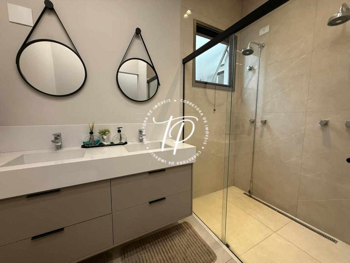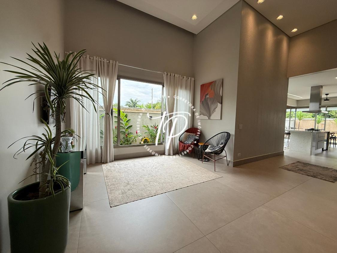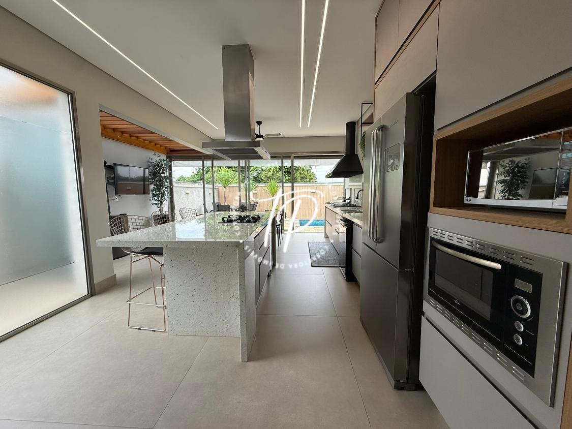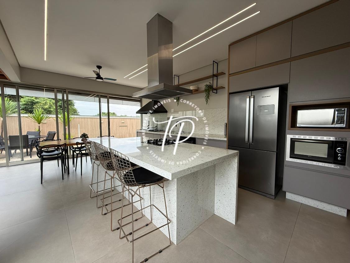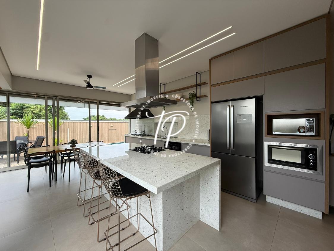 Hall de entrada, Sala para 2 ambientes com pé direito duplo, lavabo com acabamento luxuoso, ampla cozinha gourmet com ilha central equipada com coifa, cooktop , armários planejados, forno de embutir, churrasqueira com grill